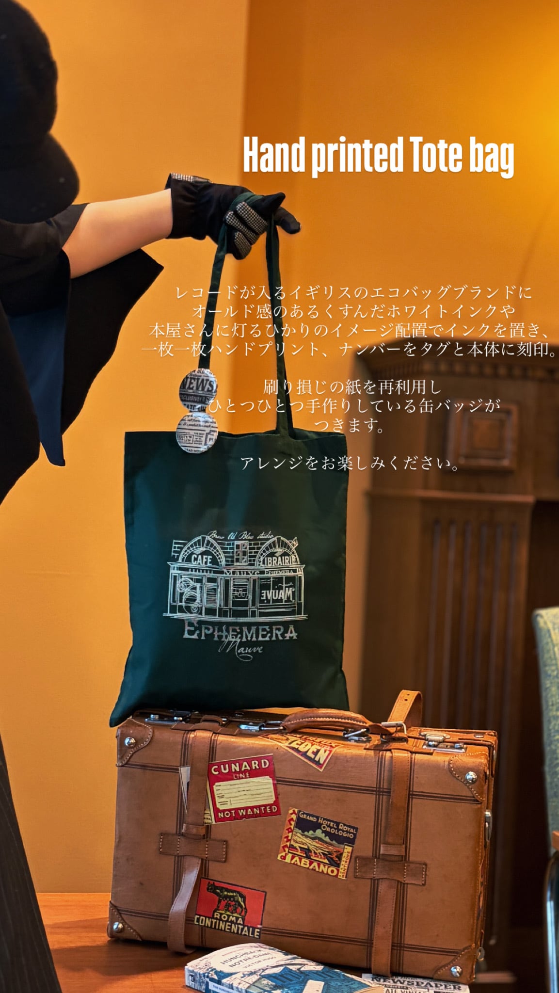 薄手の素材感と、カラーリングが魅力的なトートバッグ深緑に色褪せたようなおしゃれなビンテージホワイトのインク。